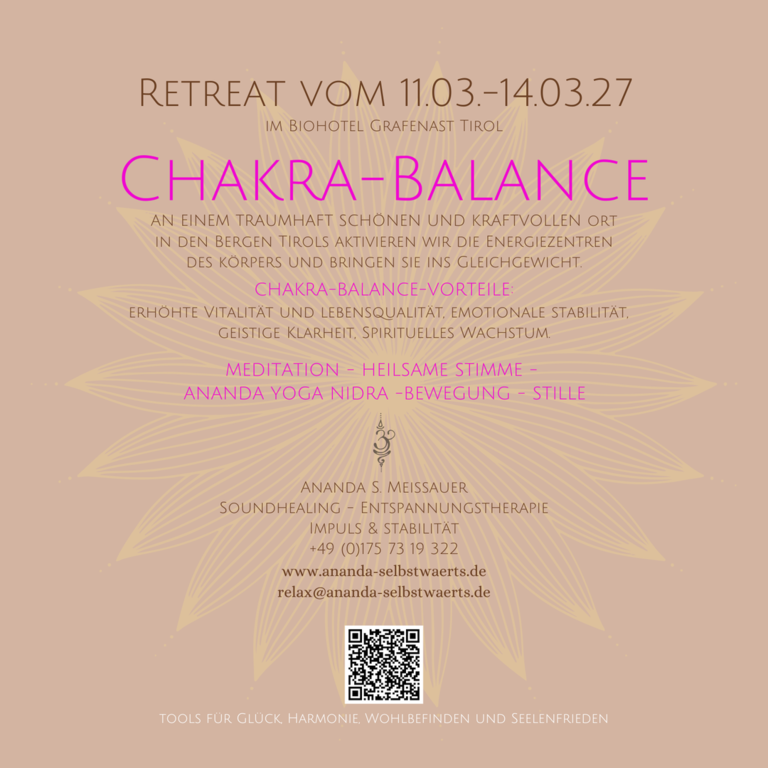 Die Chakra-Aktivierung wirkt wohltuend, kraftvoll und ausgleichend auf das gesamte Körper-Geist-System und somit auch auf unsere Lebensthemen. In diesem Retreat lernen und erfahren wir, wie wir diese subtilen Energiezentren wahrnehmen können und ein Ungleichgewicht in diesen Bereichen beheben und stärken können.